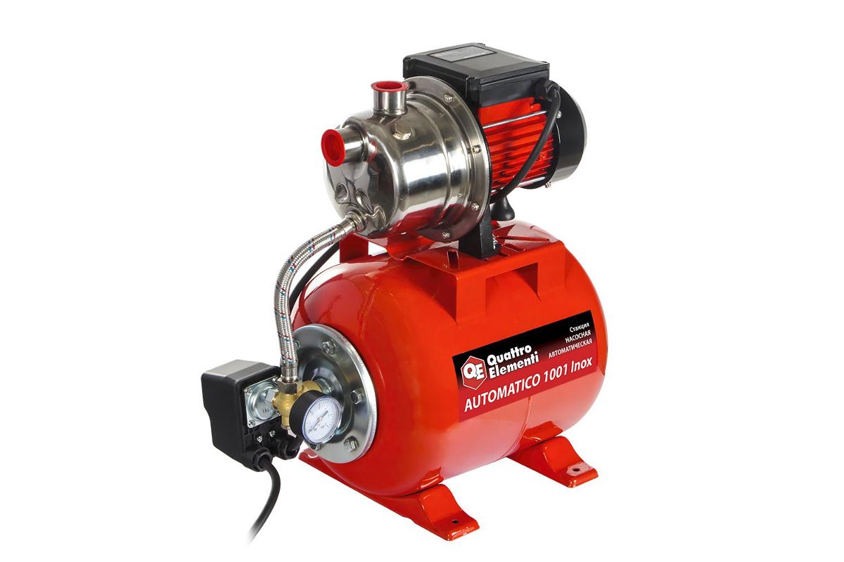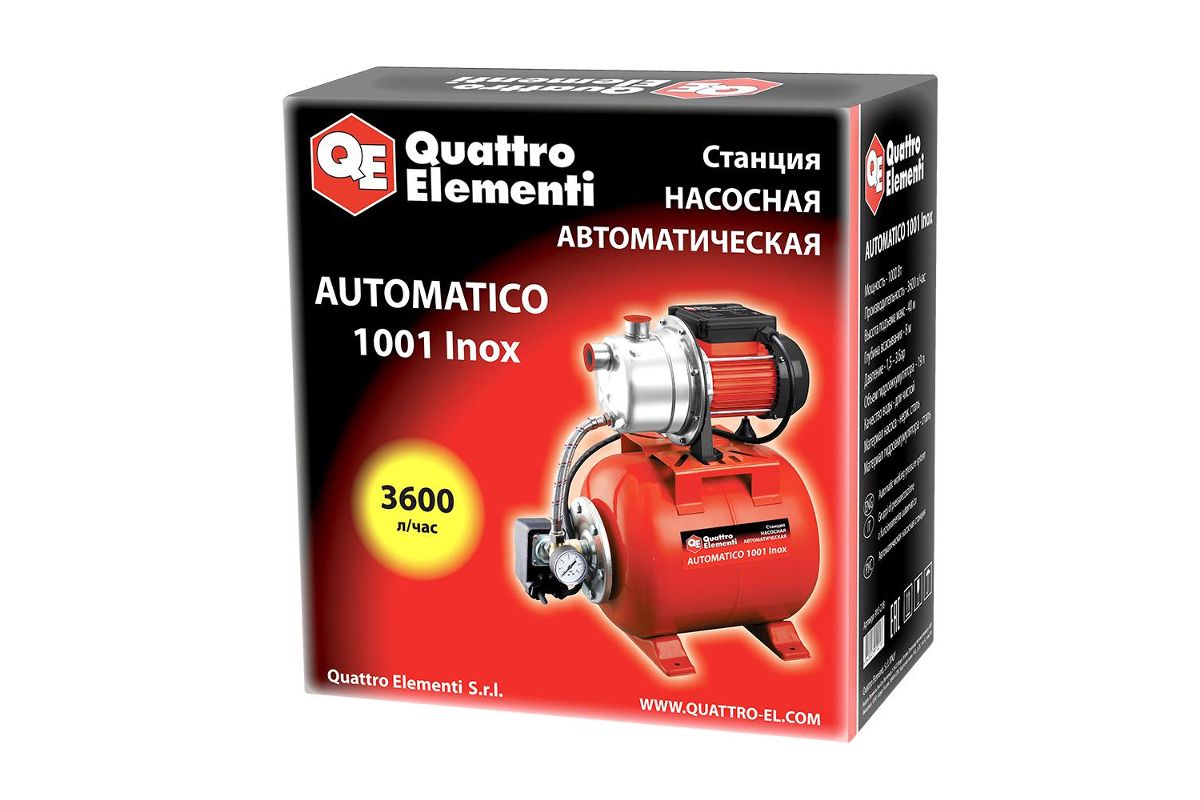 QUATTRO ELEMENTI 1001 Inox 910-218 – автоматическая насосная станция с гидроаккумулятором. Предназначена для перекачивания воды из водоёмов, резервуаров, колодцев, скважин и магистральных водопроводов. Подходит для организации систем полива и орошения, а также для бесперебойного водоснабжения частных домов, дач, фермерских хозяйств и др. Работает с чистыми жидкостями без песка, грязи, абразивных частиц и волокнистых включений. Максимальная производительность по воде – 3600 л/ч.